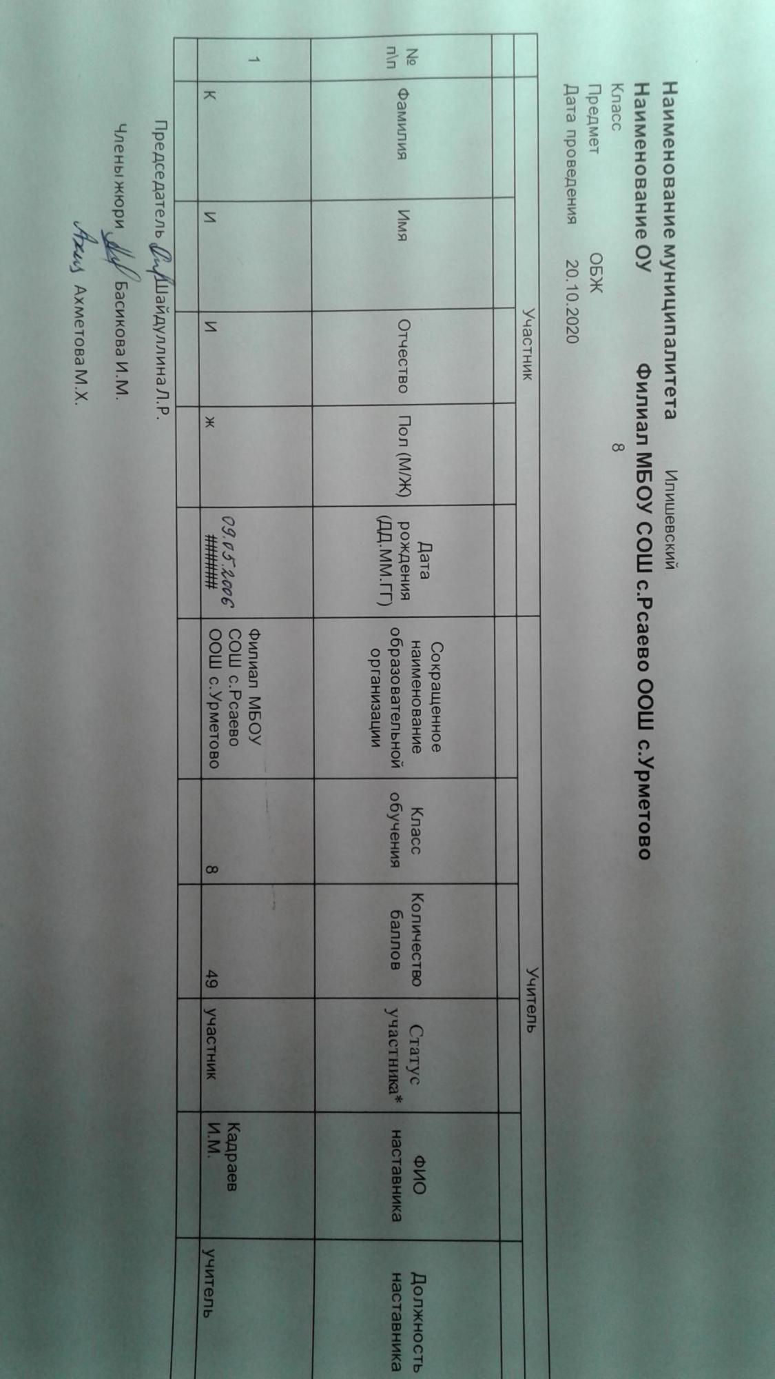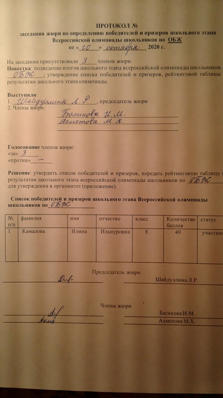 Протокол ВОШ ШЭ по ОБЖ в 8 классе