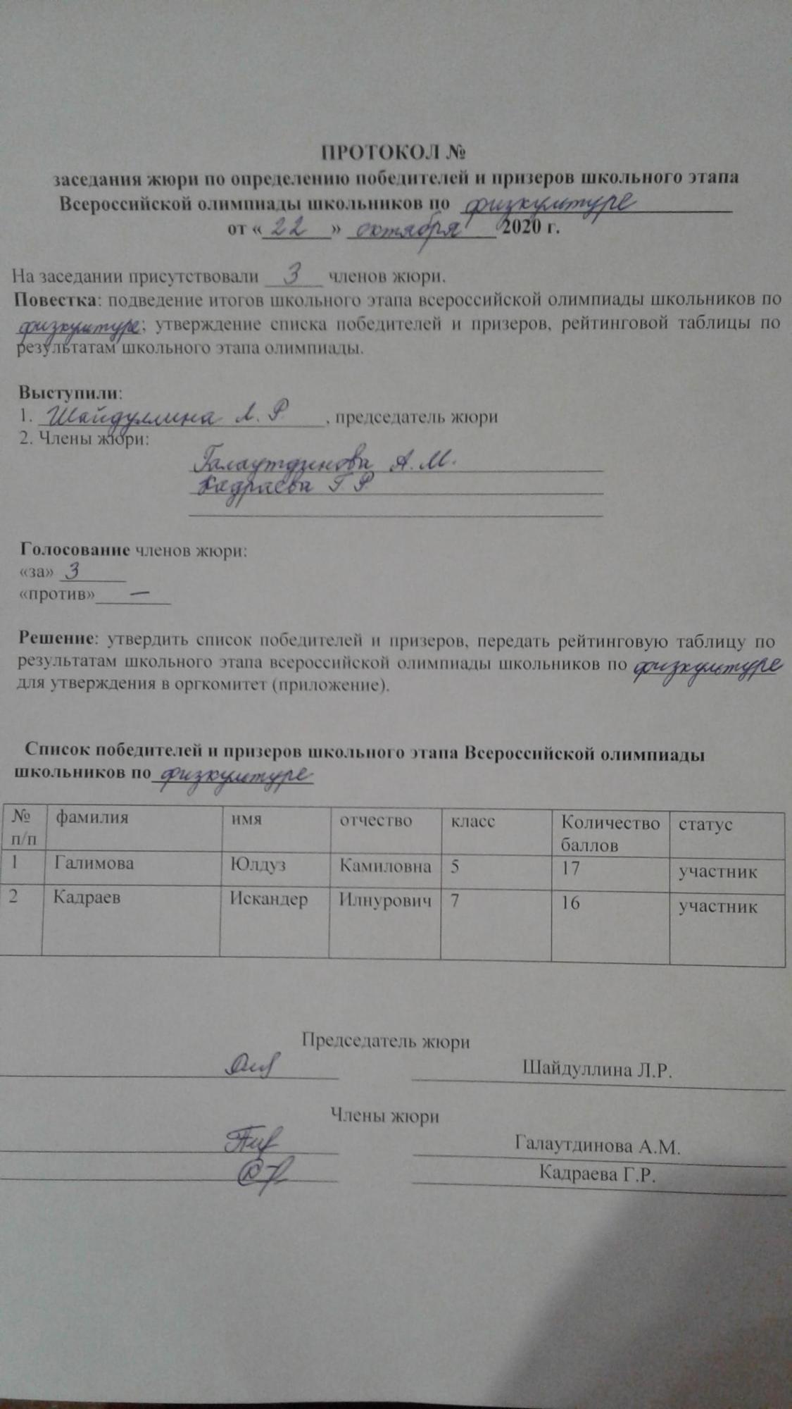 Протокол ВОШ ШЭ по физической культуре